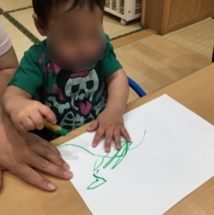 今日は”パパ大好きだよ”って思いを込めながらなぐり描きで模様を描きました。(*^^*)腕を回して…