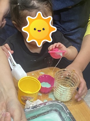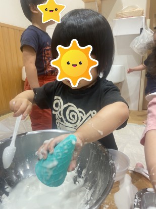 片栗粉に水を加えて感覚遊びをしました😆
