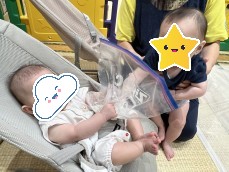 0歳児さんもジップロックに入れた片栗粉で感触遊びを楽しみました🥰